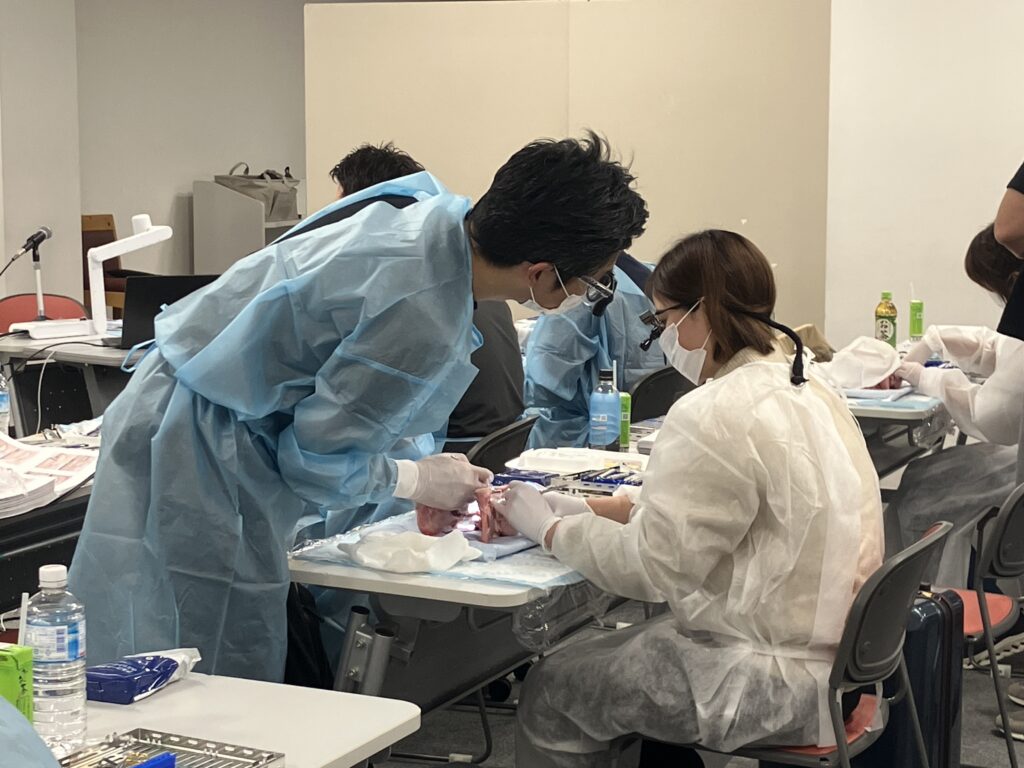 2日目のハイライトは、徹底したハンズオンと豚骨を用いた実習です。 歯周形成外科において、フラップのデザイン、減張切開の精度、そして縫合技術の一つひとつが予後を左右します。